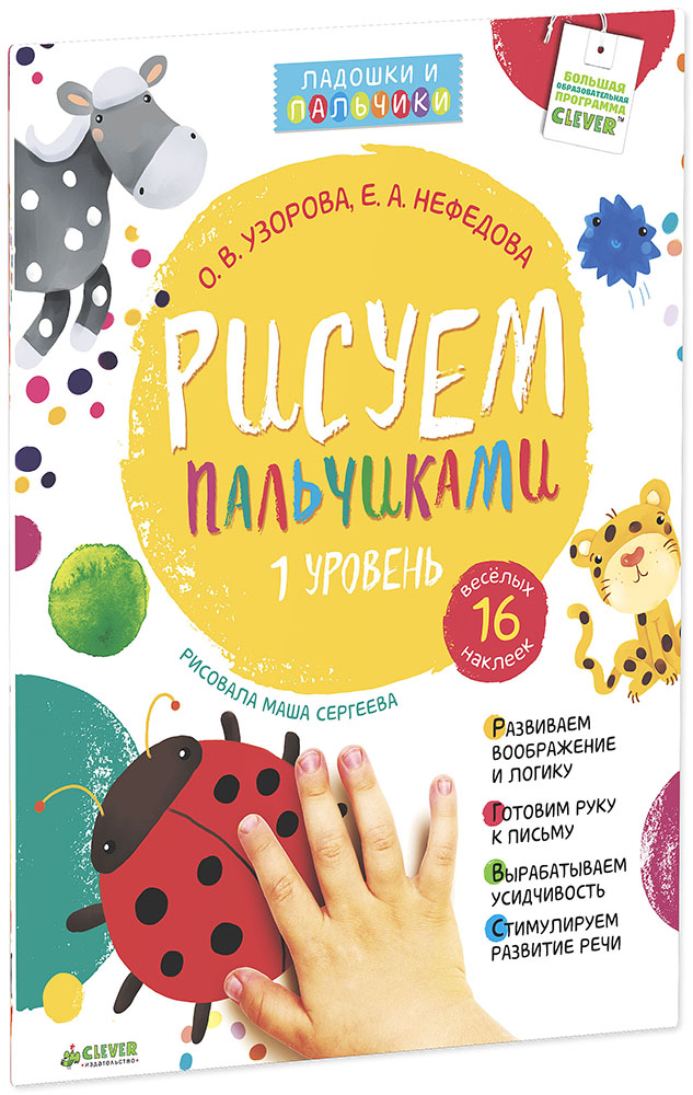 Все малыши обожают рисовать пальчиками. Знаете ли вы, что даже стихийное каляканье красками положительно влияет на развитие ребёнка? Малыш, рисуя пальчиками, совместит удовольствие от творчества с массой полезных занятий. Каждое занятие с книгой «Рисуем пальчиками» — это маленький спектакль со стихами, разговорами о картинке, развивающей гимнастикой и идеями для творчества. Детям предлагается послушать двустишие, которое станет темой для дальнейшего занятия. Затем найти образец, на который нужно ориентироваться и эскиз будущего рисунка. Здесь же вместе с ребенком вы можете сделать развивающую гимнастику и найти массу идей для творчества. А после выполнения задания, малыш может наклеить наклейку и перейти к следующим страничкам книги.