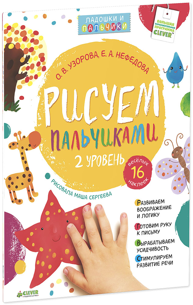 Занятия по книге «Рисуем пальчиками. 2 уровень» — это маленький спектакль со стихами, разговорами о картинке, развивающей гимнастикой и идеями для творчества. Детям предлагается послушать двустишие, которое станет темой для дальнейшего занятия. Затем найти образец, на который нужно ориентироваться и эскиз будущего рисунка. Здесь же вместе с ребенком вы можете сделать развивающую гимнастику и найти массу идей для творчества. А после выполнения задания, малыш может наклеить наклейку и перейти к следующим страничкам книги. Для второго уровня разработаны чуть более сложные задания по сравнению с первым уровнем: более сложные рисунки, а в конце книжки малыш будет на одном занятии использовать целую радугу красок.