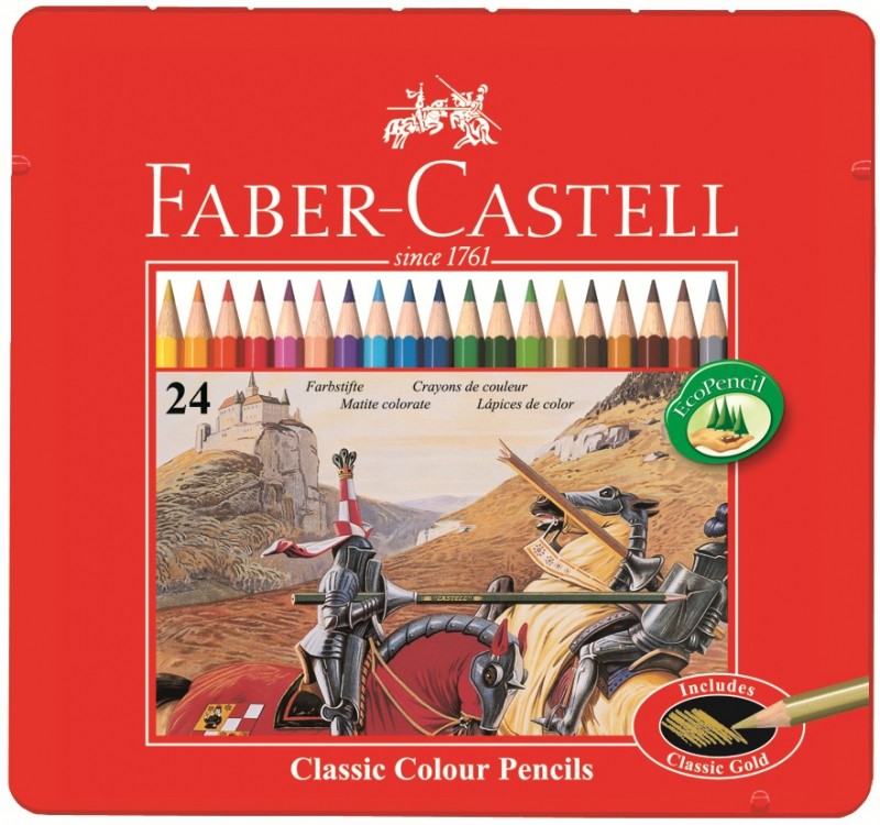 Карандаши упакованы в металлическую красную коробку с символами Фабер-Кастелл: белым логотипом и изображением средневековых рыцарей в доспехах, сражающихся на карандашах.