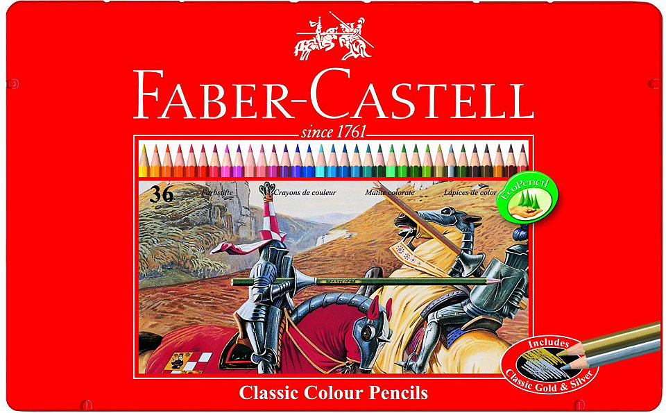 Карандаши упакованы в тонкую металлическую коробку красного цвета с надписью Фабер-Кастелл. Но главный акцент в оформлении обращен к изображению: сцена сражающихся рыцарей в доспехах превратилась в логотип, который вы можете увидеть на любой продукции легендарной немецкой марки.